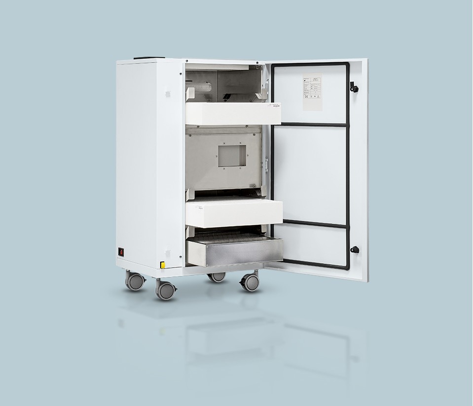 Its exceptional versatility and multiple mounting options allow the device to adapt seamlessly to any environment, including compact spaces. Depending on specific requirements, the Steel unit can be easily installed on walls (in either horizontal or vertical orientation) or mounted to the ceiling. It is constructed from AISI 304 stainless steel—a high-grade material widely used in operating rooms for its superior hygiene standards and excellent resistance to corrosion.