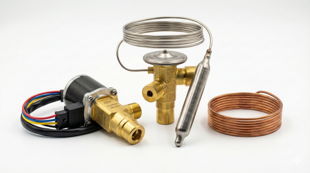 Expansion valves control the flow of refrigerant into the evaporator, maintaining correct pressure and temperature. Thermostatic and other expansion devices improve cooling efficiency and protect compressors from damage.